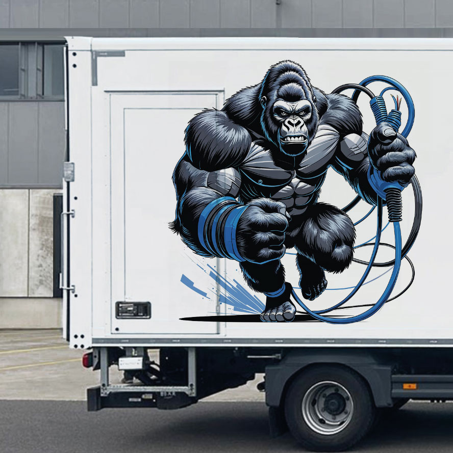 12ender bringt die LKW-Flotte von Wallraff – einem Elektrogrosshandel – zum Leben: Starke Tiermotive wie dieser Gorilla, fungieren als sympathische „tierische Elektriker“ und sorgen im Straßenverkehr für einen uniquen amüsanten Blickfang!